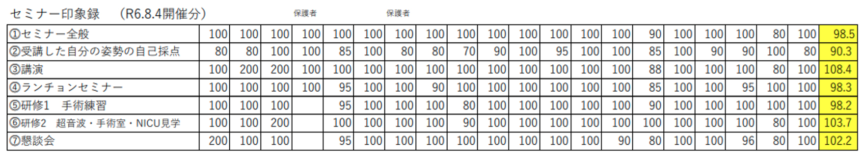 (1)セミナー全般;101点、(2)受講した自分の姿勢の自己採点;82点 (3)講演 ;97点、(4)昼食会; 96点 (5)研修1 手術練習; 99点、研修2:超音波検査・病棟見学;97点、(7)懇談会;95点でした。