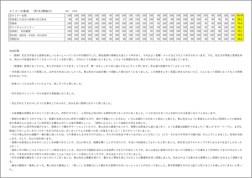 評価結果は以下の通りです。100点満点の平均点を記載しています(一部100点以上の得点をつけてくれた高校生もおり、平均が100点以上になっているものもあります)。(1)セミナー全般 98.5点、(2)受講した自分の姿勢の自己採点 90.3点、(3)講演 108.4点、(4)ランチョンセミナー 98.3点、(5)研修1 手術練習 98.2点、(6)研修2 超音波・手術室・NICU見学 103.7点、(7)懇談会 102.2点