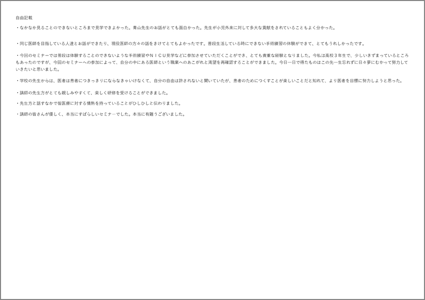 (2)自分の夢が決めきれていないことにあせりを感じていましたが、体験して医師ってすばらしい職業だなと感じました。このセミナーに参加して、この病院に来て、ここの先生方に出会えて私はとても幸せです。自分の夢に向かってがんばります。(B君)