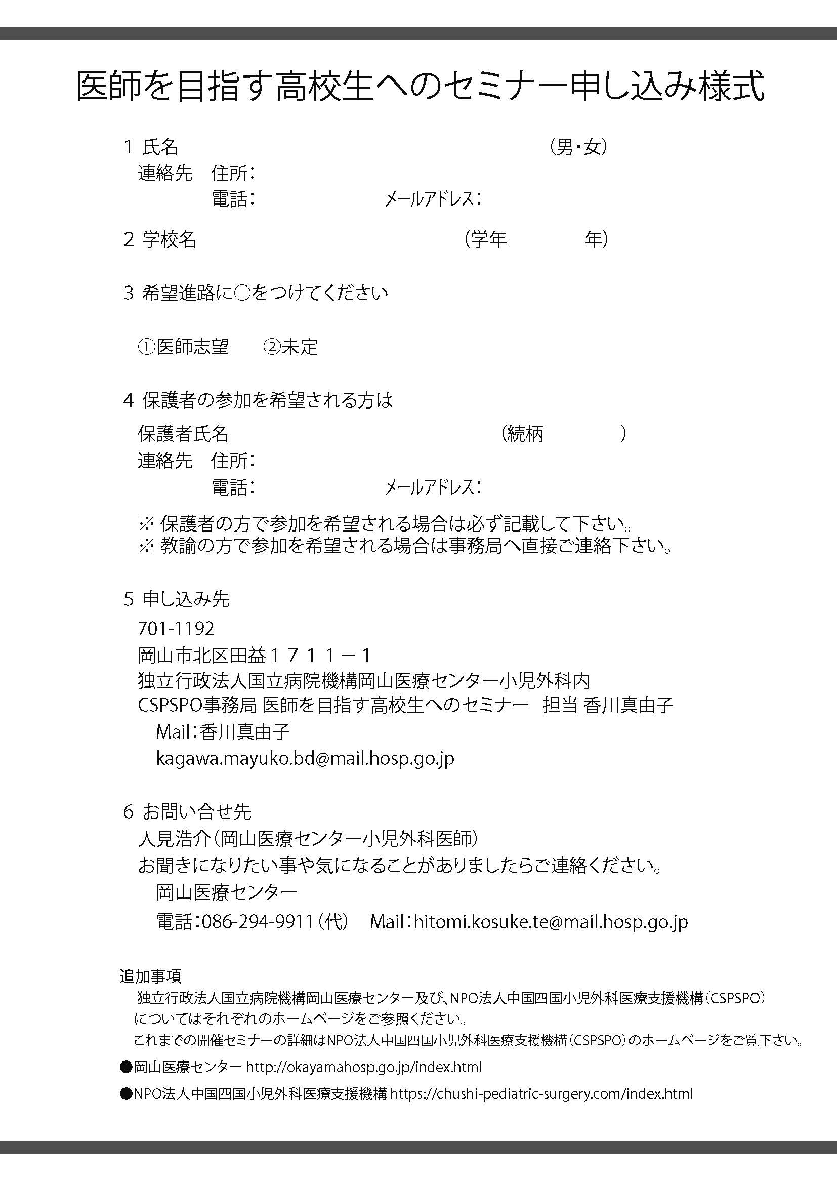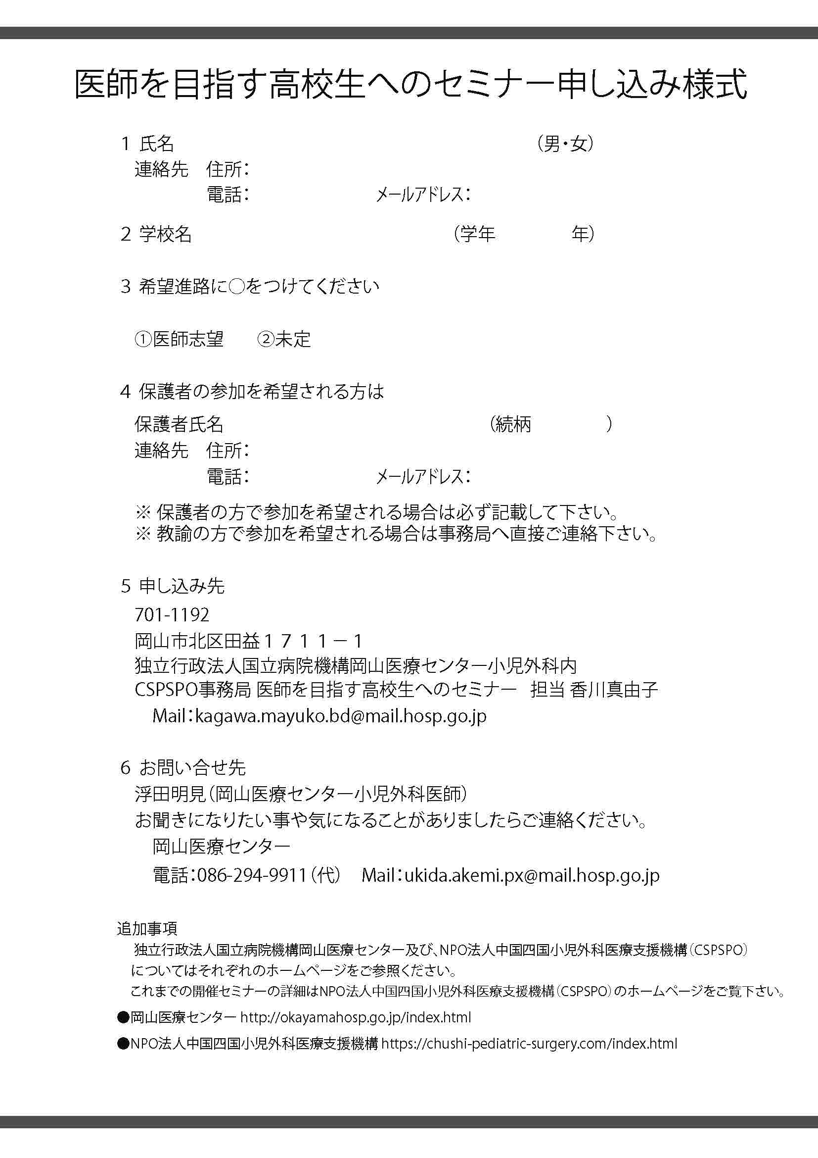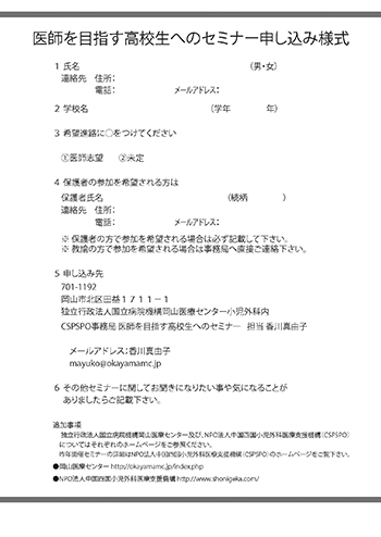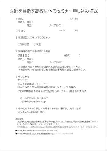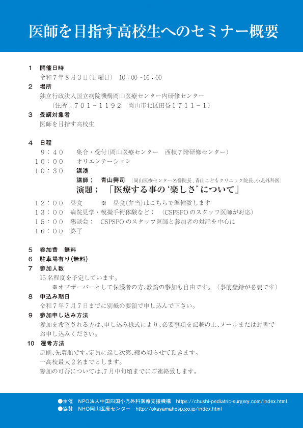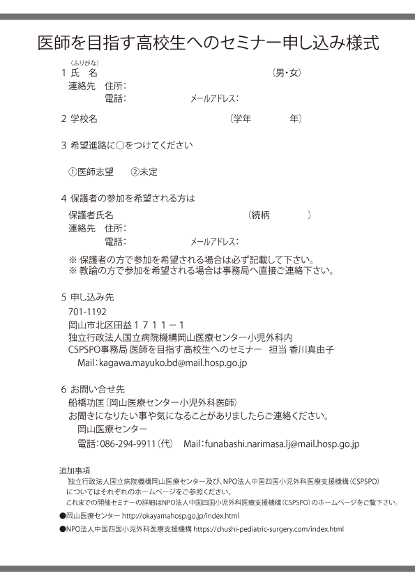 | 国立病院機構岡山医療センター 小児外科 | Tel : 086-294-9911 | Fax : 086-294-9255 |