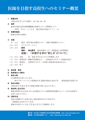 この会は医師を目指す高校生に医療の楽しさを伝え、高い志を持って医師の道を目指す生徒が増える事を期待して平成27年8月に第1回を開催したものです。毎年8月に行っています。本年も8月19日に行いました。