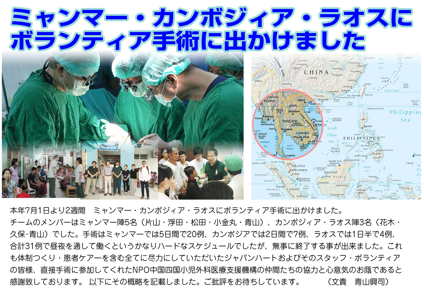 NPO法人中国四国小児外科医療支援機構は長年にわたり、国際医療NGOジャパンハートと連携して国際医療支援を行ってきましたが、COVID-19感染拡大に伴い現地活動がここ数年途絶えておりました。この度の渡航制限の緩和を受け、2022年5月3〜11日、岡山医療センターから中原康雄先生、倉敷中央病院から花木が現地での活動を行いました。