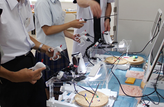 当日は、朝10時からの講演、クイズ・談話しながらの昼食、午後からは手術縫合練習、腹腔鏡のトレーニング、超音波検査体験・新生児集中治療室・手術室・小児病棟の見学、懇談会など盛り沢山で午後4時まで休む暇無しの体験でした。