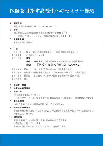 27年8月8日 第1回高校生の為のセミナーを開催致しました。岡山県の高校から9名、広島県の高校から8名で公募数15名に対し合計17名の参加となりました。