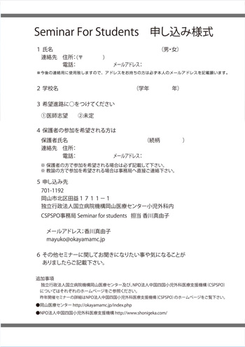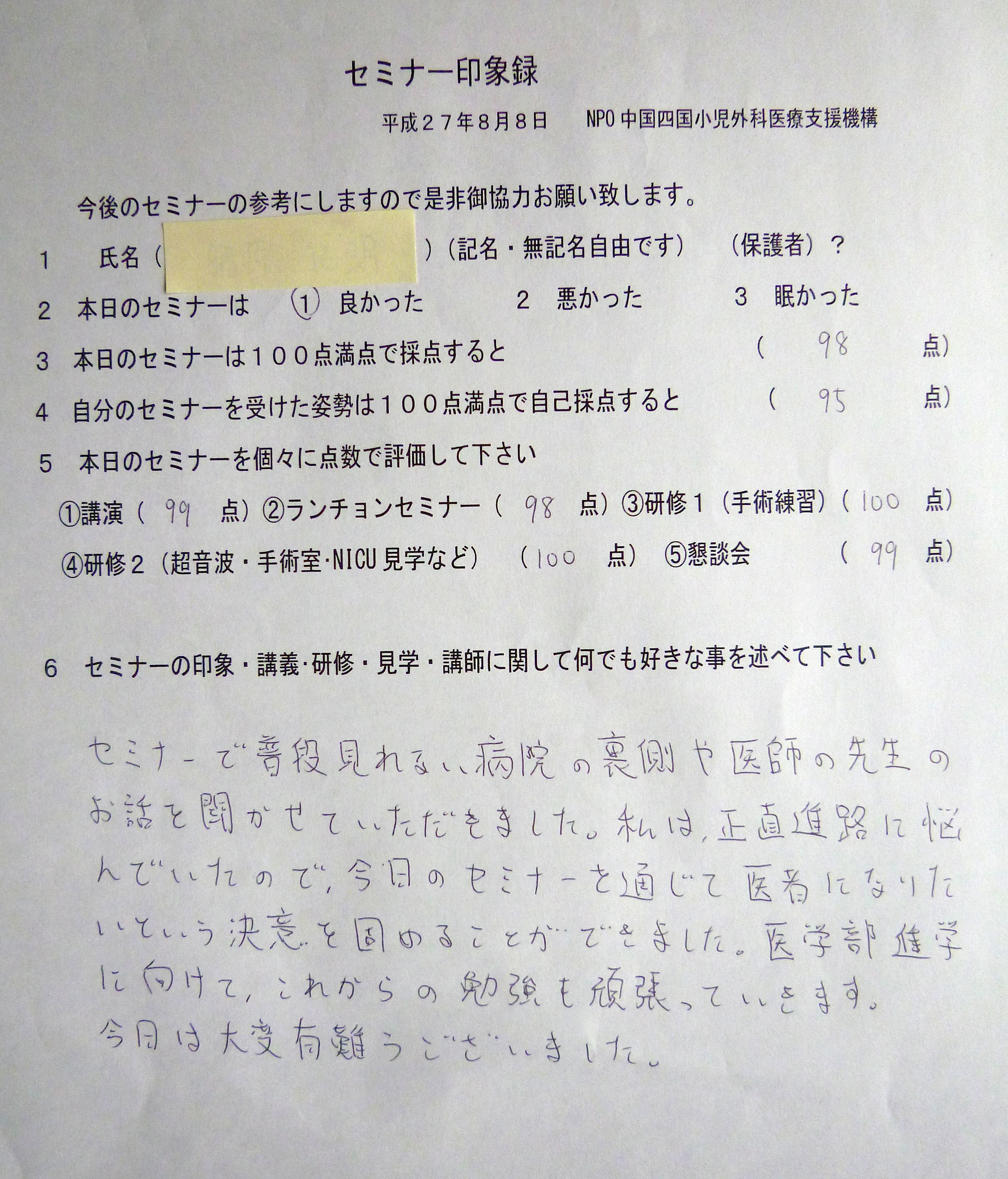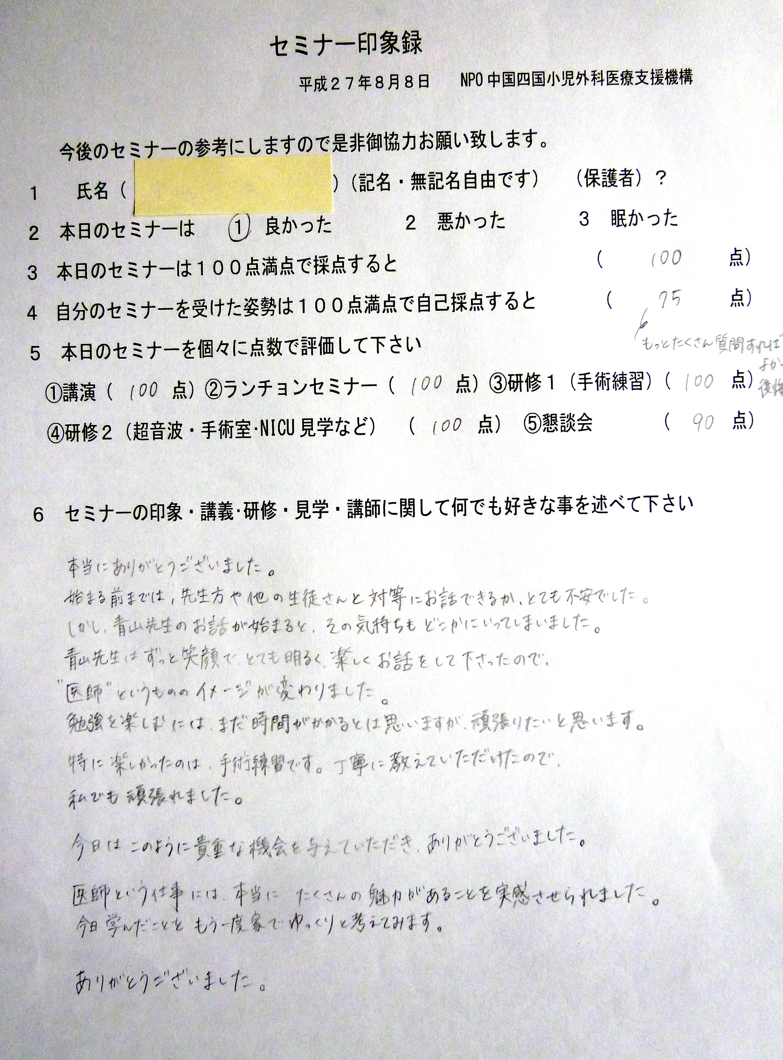 (5)私は社交不安障害で精神科に通っていた時期があり、そこで良い医師と出会ったことが医師になりたいと思ったきっかけでした。しかし、今日のセミナーに参加することで、小児科や外科もとてもカッコイイと憧れをいだきました。講義を聞いて医師は本当に素晴らしい仕事だと思いました。手術練習のときに、先生方が「上手だね」とほめて下さったので、とても嬉しかったです。自分に自信がつきました。今日のセミナーは、先生方の気さくな感じがとても良かったです。受験勉強をがんばって、絶対に医師になりたいと思える素晴らしいセミナーに参加することができて、幸せです。