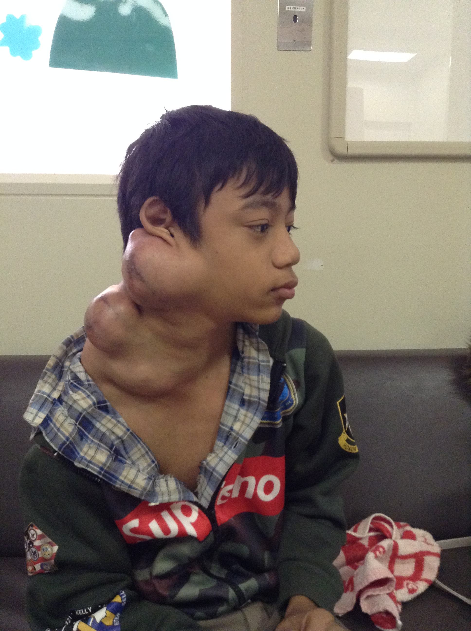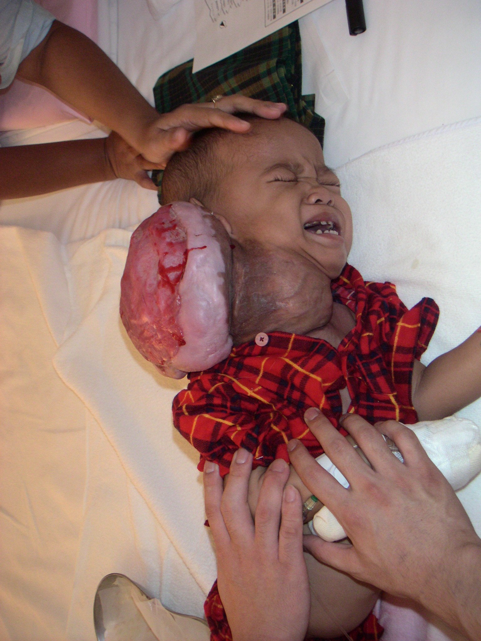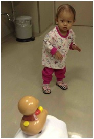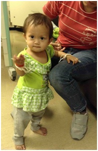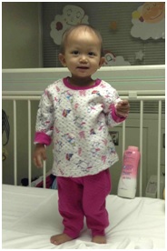 来院時は7kgしかなく、1.2kgの腫瘍を考えると、正味の体重は6kg程度で、これは生後5-6ヶ月時の体重であり、強度の栄養不良状態でした。来院後2日目(8月7日)に手術し、術後5日目から授乳開始、2週間目から少しずつ離乳食を開始しました。これが生まれて初めての離乳食だったそうです。術後9日目より抗癌剤投与開始、術後20日目より放射線療法(7日間)を併用しました。その後は順調に経過し、1歳4ヶ月頃から掴まり立ちが可能となりました。この頃VISAの関係で一時ラオスに帰り、家族と共に過ごしました。1週間のラオス滞在前後のナムソムちゃんの変化には驚かされました。少し手を添えるだけでしっかりと一人で立てるようになり、目の輝きなど全てで急に成長したように感じました。この年齢の子供にとって、わずか1週間でも兄弟家族と共に過ごす事の重要性を思い知りました。その後は順調に経過し、徐々に一人歩きが出来る様になり、数語の日本語が話せる様になり、退院することが出来ました。