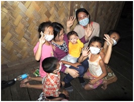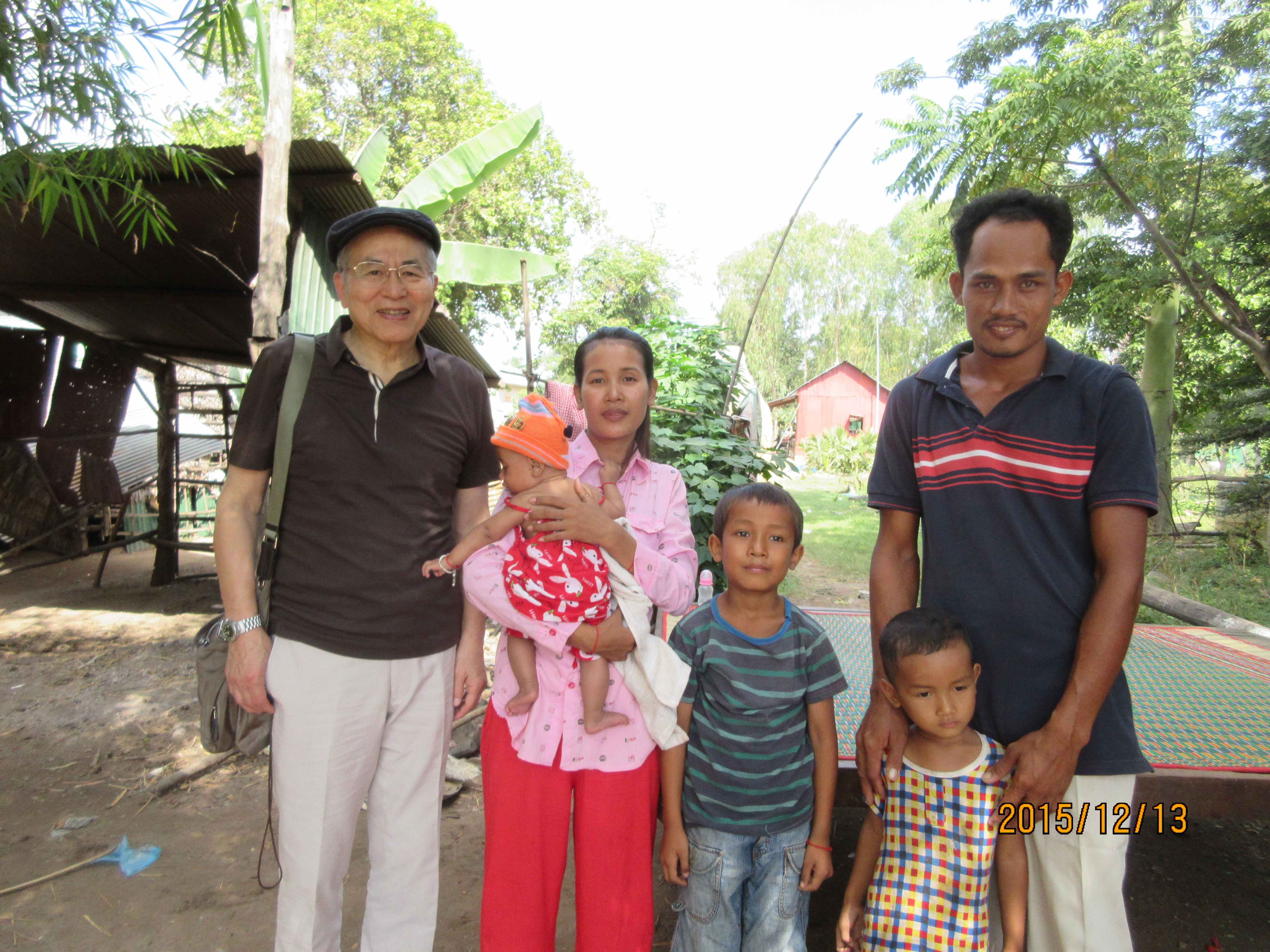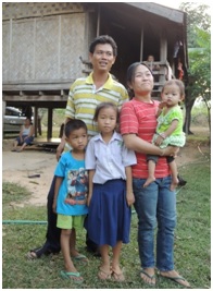2 マカラ君の自宅で。両親・兄弟と 来院前、カンボジアで抗癌剤を受けるために飼い牛を売却したそうです。 日本では医療費の家族負担が無いように配慮しました。 |