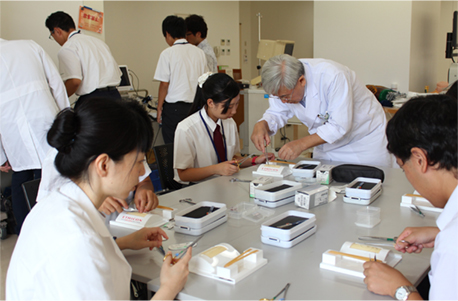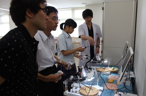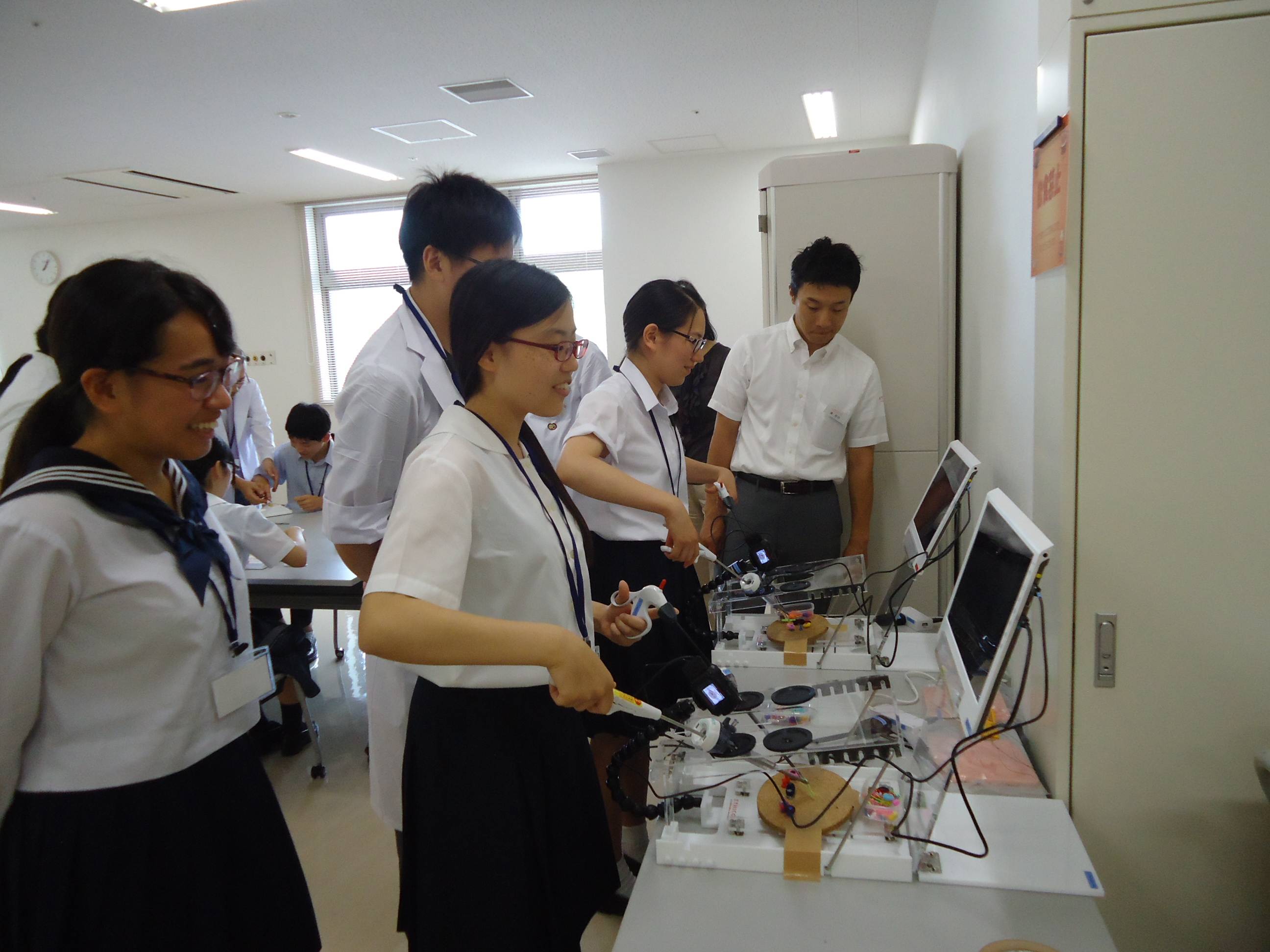 当日は、朝10時からの講演、クイズ・談話しながらの昼食、午後からは手術縫合練習、腹腔鏡のトレーニング、超音波検査体験・新生児集中治療室・手術室・小児病棟の見学、懇談会など盛り沢山で午後4時まで休む暇無しの体験でした。
