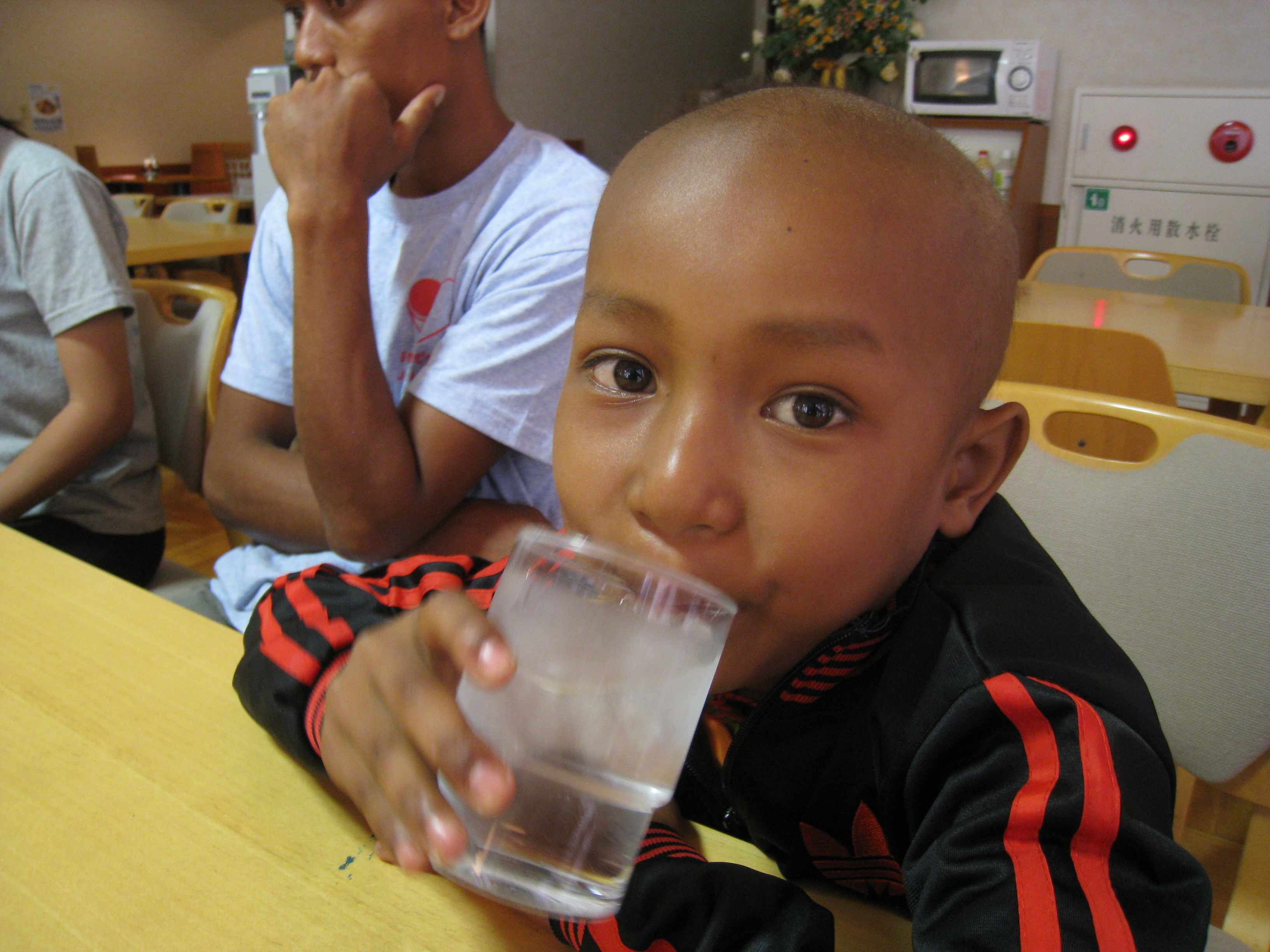 | 1 マカラ君 岡山で手術後3週間目。帰国直前のマカラ君 抗癌剤の為、頭髪が無くなっています。 |