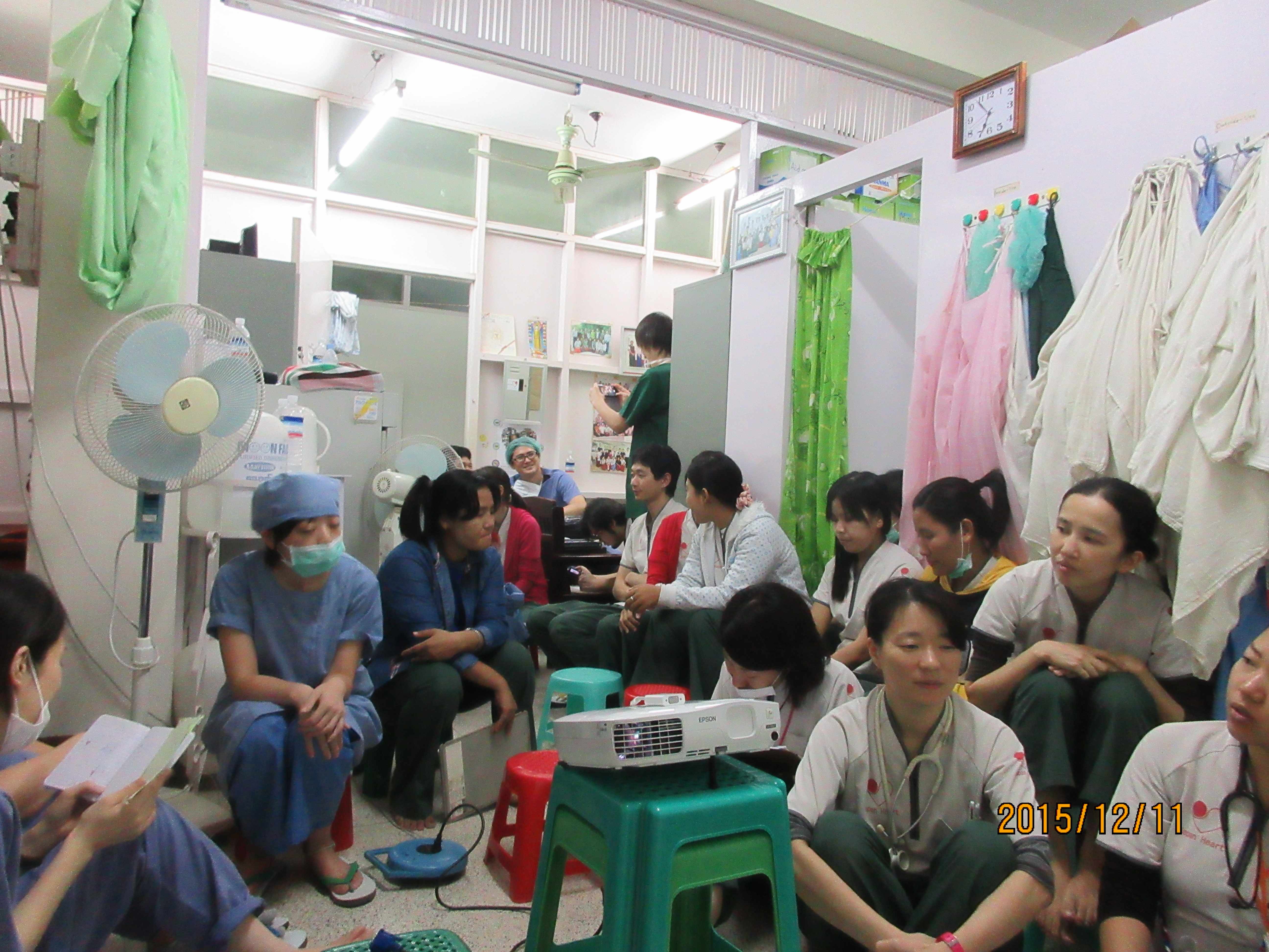 2) 2014.12.04 到着当日の外来待ち患者です。 | 3) 2014.12.07 手術終了後(23:00頃)のカンファレンスです。 |