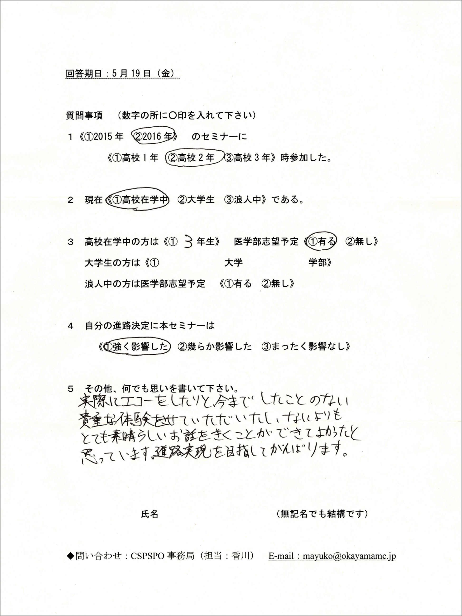 実際にエコーをしたりと、今までしたことのない貴重な経験をさせていただいたし、なによりもとても素晴らしいお話しをきくことができてよかったと思っています。進路実現を目指して頑張ります。