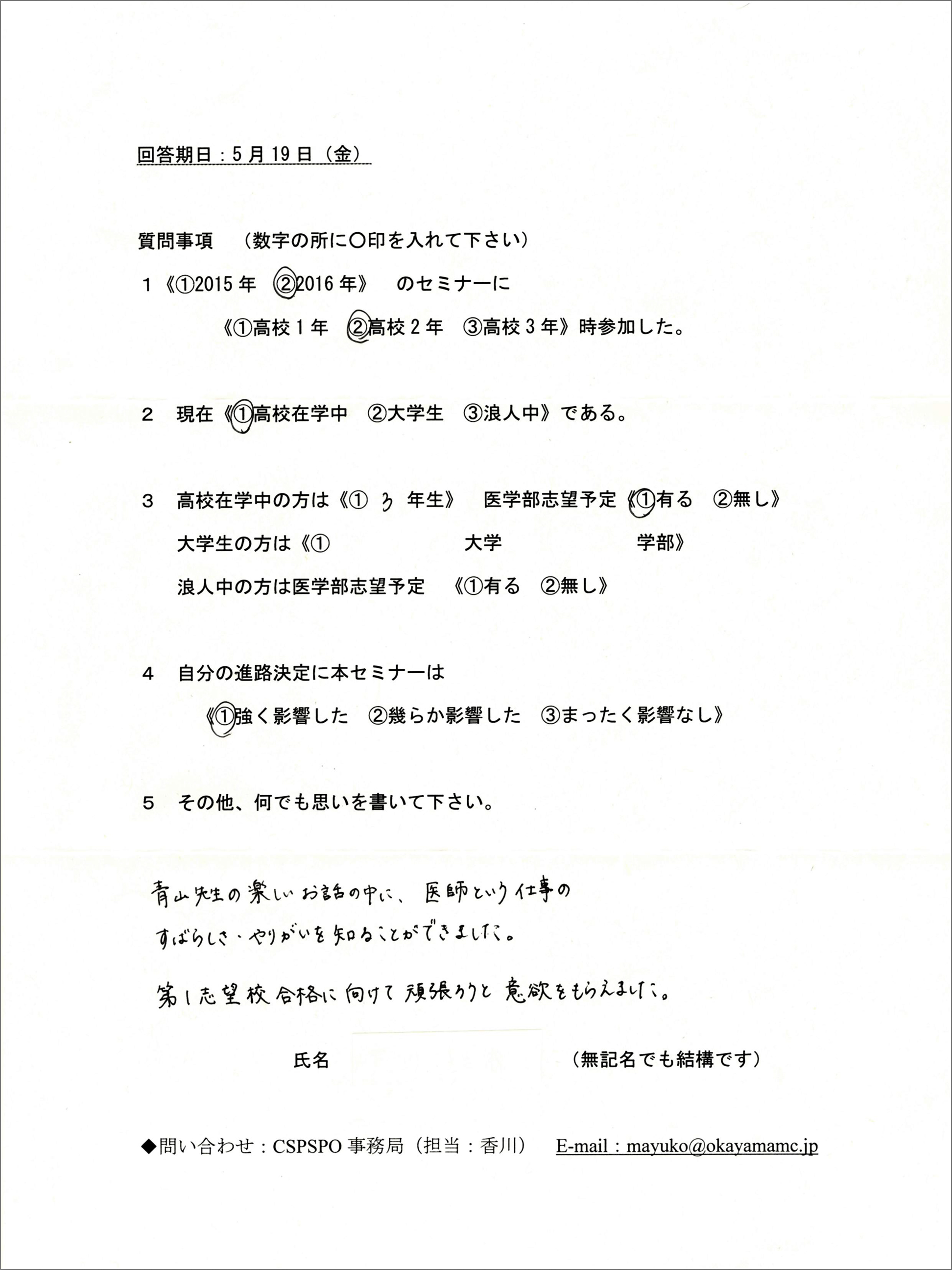 参加者17名中12名から回答を得ました。12名中参加時、1年生3名・2年生6名・3年生3名でした。卒業者3名中2名は医学部に合格しており、1名は医学部を目指して浪人中です。参加時1年生2年生だった学生は今、医学部を目指して勉学に励んでおります。