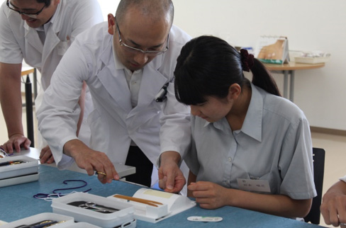 (3) 講演をしている青山先生が本当に楽しそうで、私もとても楽しく受けることができました。他の先生方も丁寧に優しく説明や指導していただいて、今日1日とても充実した時間が過ごせました。日本だけでなく海外でも平等に医療を提供する活動もされていて、とても魅力を感じました。『絶対医師になりたい』と強く感じました。(生徒C)