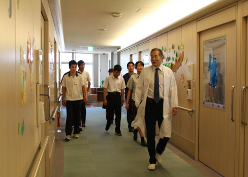 | 1) 外科部長・小児科教授の案内で院内を散策中です。 | 2) 非常に落ち着いた綺麗な小児病院です。 |