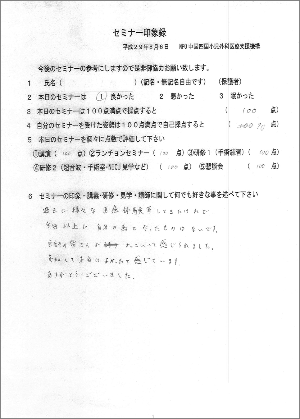 評価結果は以下の通りです。100点満点の平均点を記載しています。当日参加された保護者3名の記載も一部含まれています。(1)セミナー全般;99点(回答者数20名)、(2)受講した自分の姿勢の自己採点;89点(17名)、(3)講演 ; 99点(20名)、(4)昼食会; 97点(20名)、(5)研修1:手術練習; 98点(17名)、(6)研修2:超音波検査・病棟見学;98点(17名)、(7)懇談会;95点(20名)、でした。